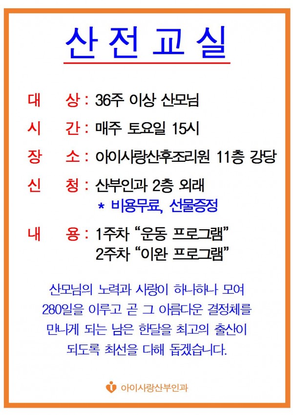 아이사랑산부인과 산전교실(운동, 이완프로그램) 페이지 정보 작성자 최고관리자 작성일19-10-01 16:22 조회4,390회 댓글0건 관련링크 다음글 목록 본문 . 댓글목록 등록된 댓글이 없습니다. 다음글 목록
