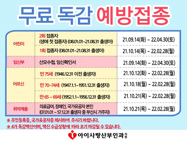 2021~2022년 무료예방접종이 2021년 9월 14일부터 실시 됩니다.