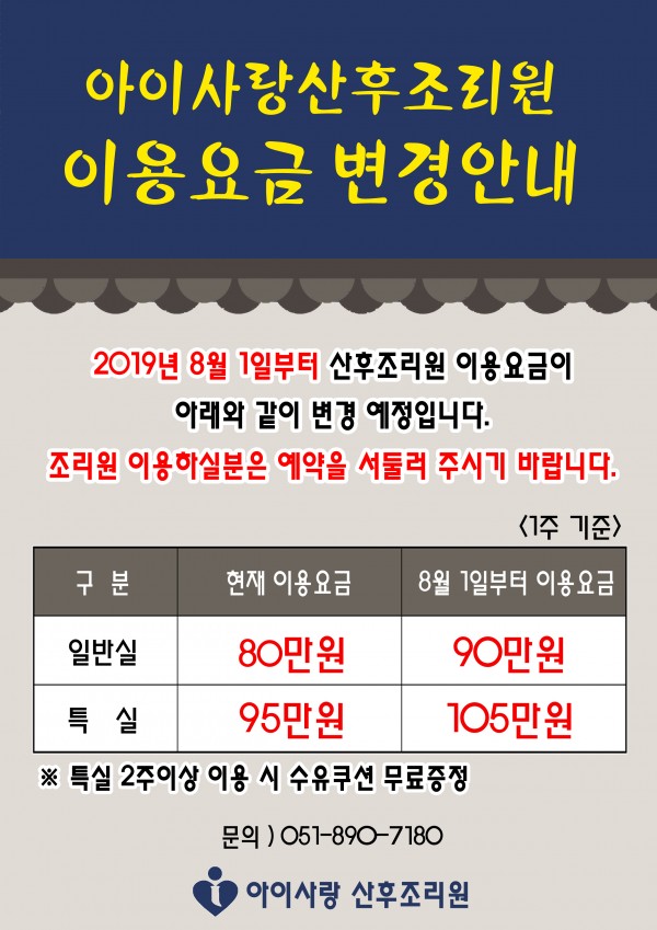 2019년 8월 1일부터 산후조리원 이용요금이 변경 예정입니다.